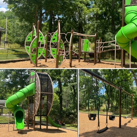 | Play Structure | Fiberglass play structure and swing set next to pavilion |