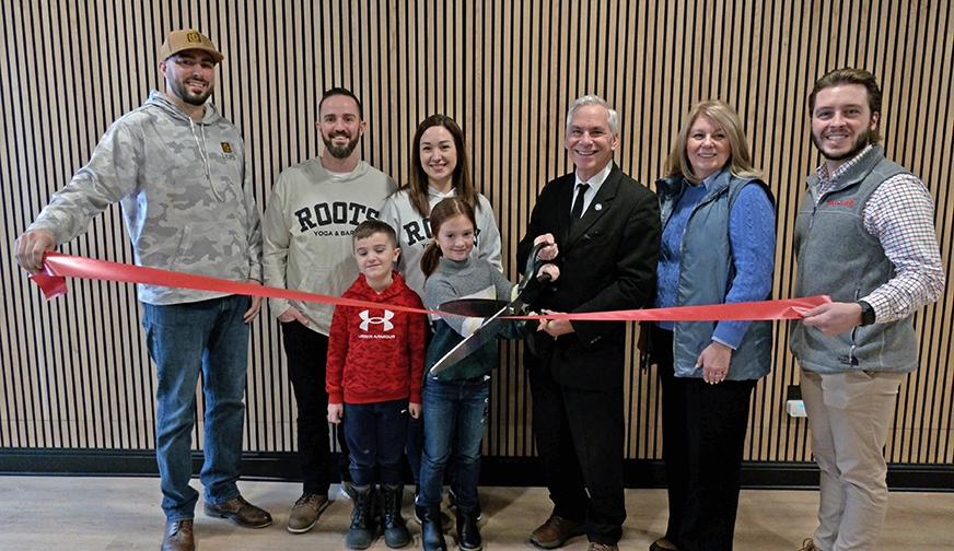 Family and friends of Jamie Winbrenner join dignitaries in the ribbon cutting for the Medina Root's Yoga & Barre.